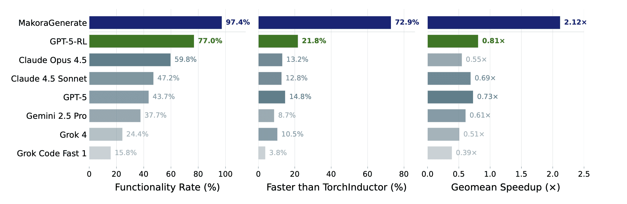 The results are promising. In a single-attempt setting, the GPT-5-RL model improves functional correctness from 43.7% to 77.0%. When integrated into our agent harness, MakoraGenerate, single attempt correctness improved to 97.4% correctness. In terms of performance, we saw similar jumps in performance, improving geomean speedup of TorchInductor-generated kernels from 0.73x, to 0.81x, and ultimately to 2.12x in MakoraGenerate