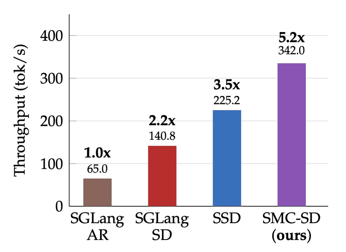Makora’s singular mission is to automatically unlock the peak performance of AI hardware. To this end, we’ve invested heavily in automated tooling focused on delivering kernel optimizations, inference engine optimizations, and algorithmic optimizations. This is to the benefit of all modern AI use cases, from RL training rollouts, multi-turn tool use, and agentic coding, which live and die by inference throughput. We’re particularly excited about techniques like SMC-SD because the “roofline” of algorithmic optimizations is much higher than those of layers of the stack. Below, we dig into the results and analysis.