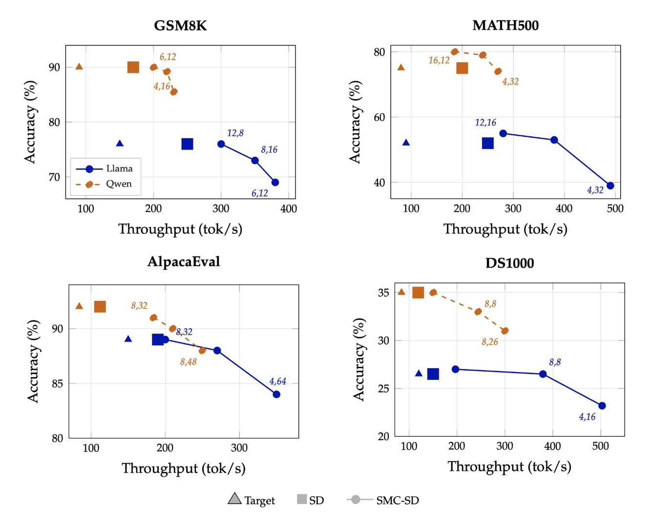 TLDR: we introduce Sequential Monte Carlo Speculative Decoding, an algorithmic optimization that achieves SOTA results in tok/s on GPU. We show test results on NVIDIA H100. Preprint and code are both available.