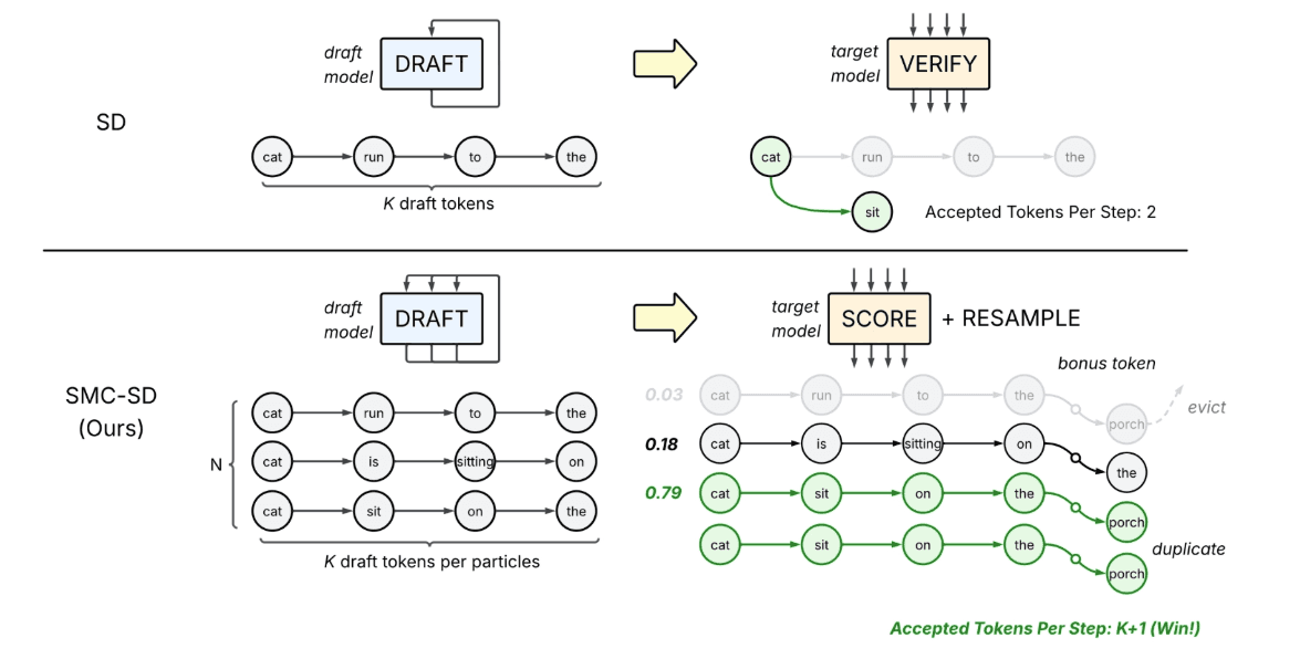 In SD, a draft model generates a single sequence of draft tokens. A target model then performs a verification step, accepting a valid prefix of verified tokens while discarding rejected tokens. SMC-SD maintains a set of N candidate sequences (particles). In each iteration, the draft model extends the N sequences by K draft tokens, where K equals 4 in the illustration above. The target model then scores these extensions and samples a bonus token. In the Resample phase, sequences with low score (e.g., .03) are evicted, while sequences with high probabilities (e.g., .79) are duplicated to form the new set of N sequences.
